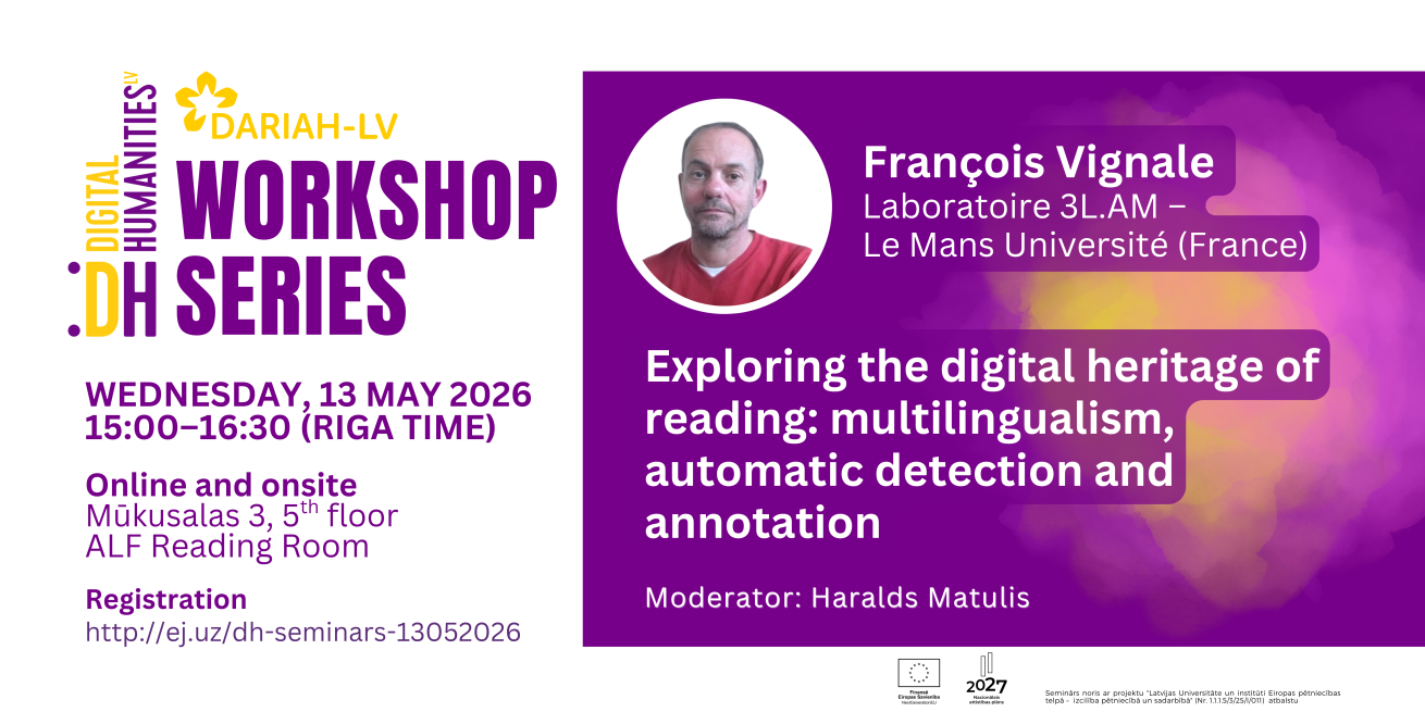 Semināru “Exploring the digital heritages of reading: multilingualism, automatic detection and annotation” vadīs viespētnieks Dr. Fransuā Viņāls (Dr. François Vignale) no Lemānas Universitātes. Savā priekšlasījumā viņš iepazīstinās ar starpdisciplināro projektu READ-IT, kas apvieno sociālās zinātnes, digitālās humanitārās zinātnes un datorzinātnes, lai pētītu lasīšanas pieredzi Eiropā dažādos laikos un kontekstos.