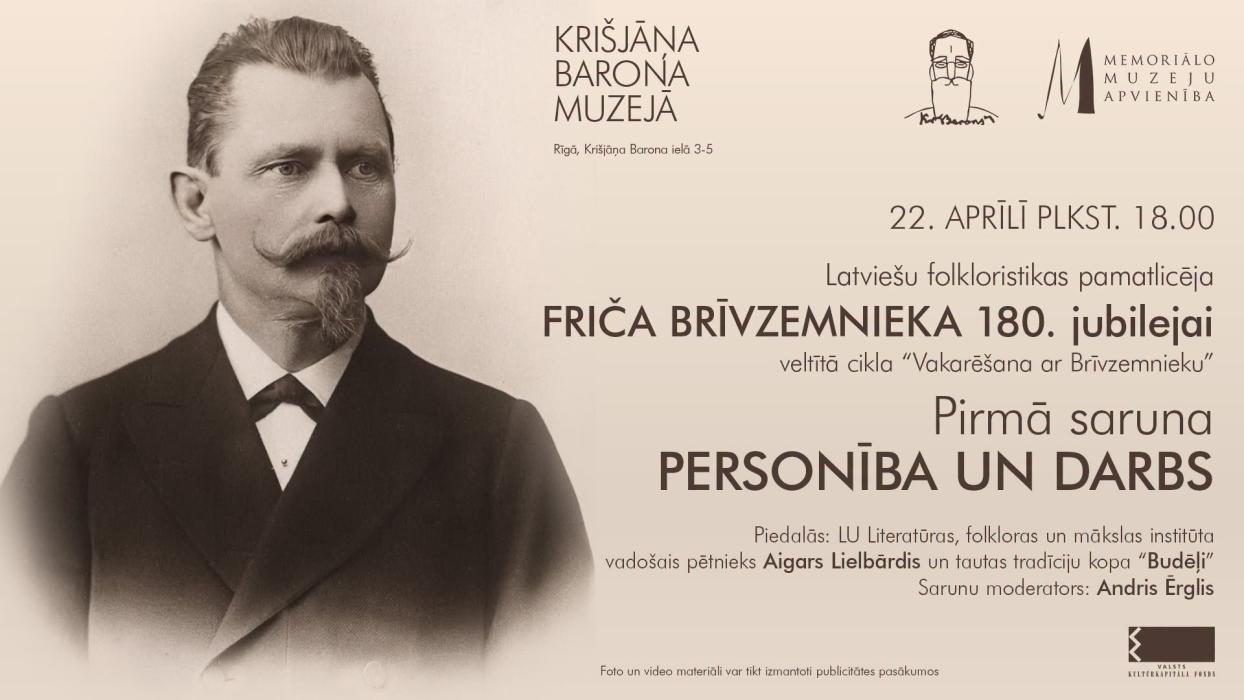 22. aprīlī plkst. 18.00 Kr. Barona muzejā (Rīgā, Krišjāņa Barona ielā 3–5) notiks sarunu cikla “Vakarēšana ar Brīvzemnieku” pirmā tikšanās, kas veltīta latviešu folkloristikas pamatlicēja Fricis Brīvzemnieks 180. gadadienai.