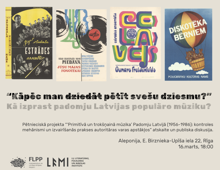 Interesenti ir aicināti apmeklēt pētnieciskā projekta “‘Primitīvā un trokšņainā mūzika’ Padomju Latvijā (1956-1986): kontroles mehānismi un izvairīšanās prakses autoritāras varas apstākļos” publisko atskaiti un diskusiju, kas notiks 2026. gada 16. martā plkst. 18.00 kultūrvietā "Aleponija" (E.Birznieka-Upīša ielā 22, Rīgā).