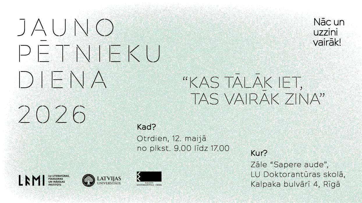 Līdz 20. aprīlim ir atvērta pieteikšanās zinātniskai konferencei “Jauno pētnieku diena 2026”, kurai aicināti pieteikties humanitāro un sociālo zinātņu doktoranti un zinātnes grāda pretendenti. Konferenci rīko LU Literatūras, folkloras un mākslas institūts sadarbībā ar LU Doktorantūras skolu.