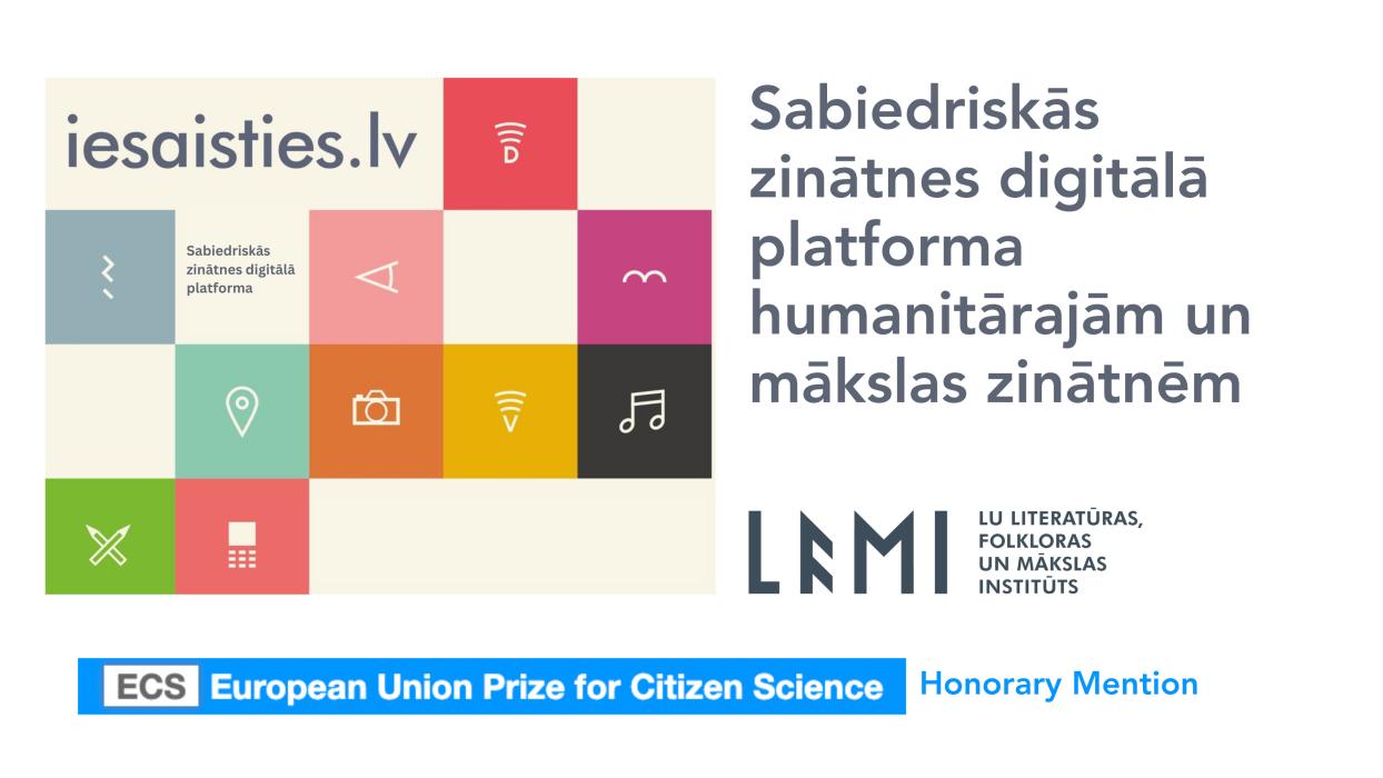 12. jūnijā paziņoti Eiropas Savienības Sabiedriskās zinātnes balvas (European Union Citizen Science Award) saņēmēji 2024. gadā. Pirmo reizi atzinība izteikta arī projektam no Baltijas – LU Literatūras, folkloras un mākslas institūta sabiedriskās zinātnes digitālajai platformai iesaisties.lv, kas piedāvā iesaistīties sabiedriskās zinātnes iniciatīvās humanitāro zinātņu un kultūras mantojuma jomā – gan pētot un ar līdzdalību atklājot ko jaunu, gan arī pieliekot roku, piemēram, manuskriptu pārrakstīšanā, informācijas precizēšanā, daloties ar savu pieredzi un zināšanām.