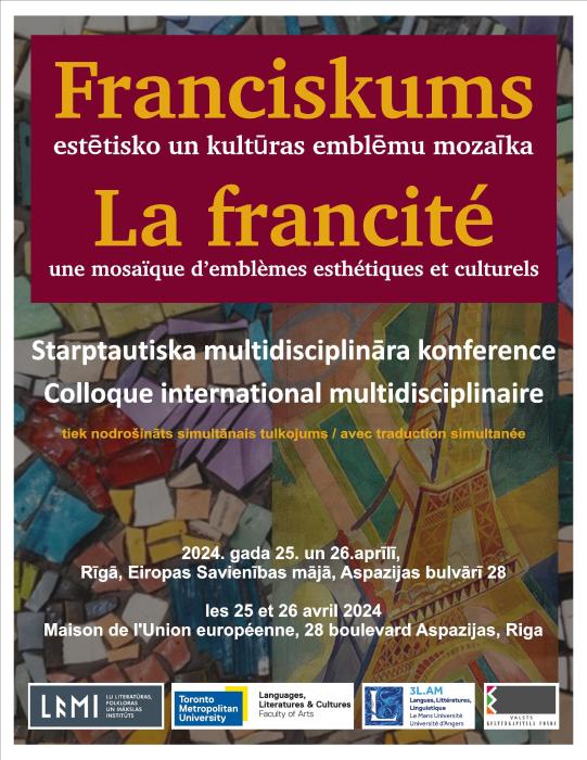 2024. gada 25. un 26. aprīlī Eiropas Savienības mājā Rīgā notiks Latvijas Universitātes Literatūras, folkloras un mākslas institūta, Toronto Metropoles universitātes Valodu, literatūru un kultūru katedras un Anžē un Lemānas universitāšu laboratorijas 3L.AM rīkota starptautiska zinātniska bilingvāla konference "Franciskums: estētisko un kultūras emblēmu mozaīka" (La francité: une mosaïque d’emblèmes esthétiques et culturels).