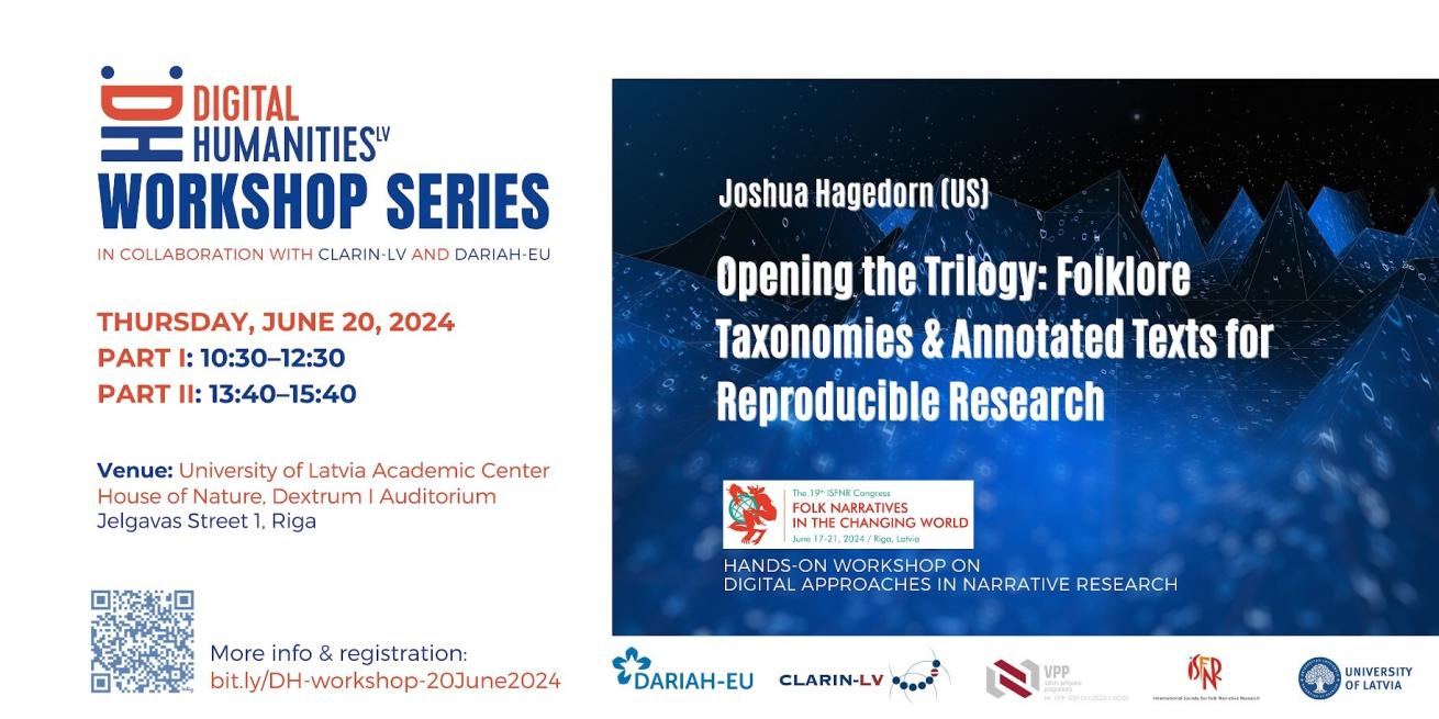 Šī gada 20. jūnijā Starptautiskās folkloras naratīvu pētniecības biedrības kongresa ietvaros (https://en.lfk.lv/isfnr2024) Latvijas Universitātes Akadēmiskā centra Dabas mājā notiks digitalhumanities.lv seminārs, kas top sadarbībā ar CLARIN-LV un DARIAH-EU. To vadīs neatkarīgais pētnieks Džošua Hagedorns (ASV). Praktiskais seminārs būs jo īpaši noderīgs folkloras pētniekiem, un tā uzmanības centrā būs darbs ar tekstu korpusiem.