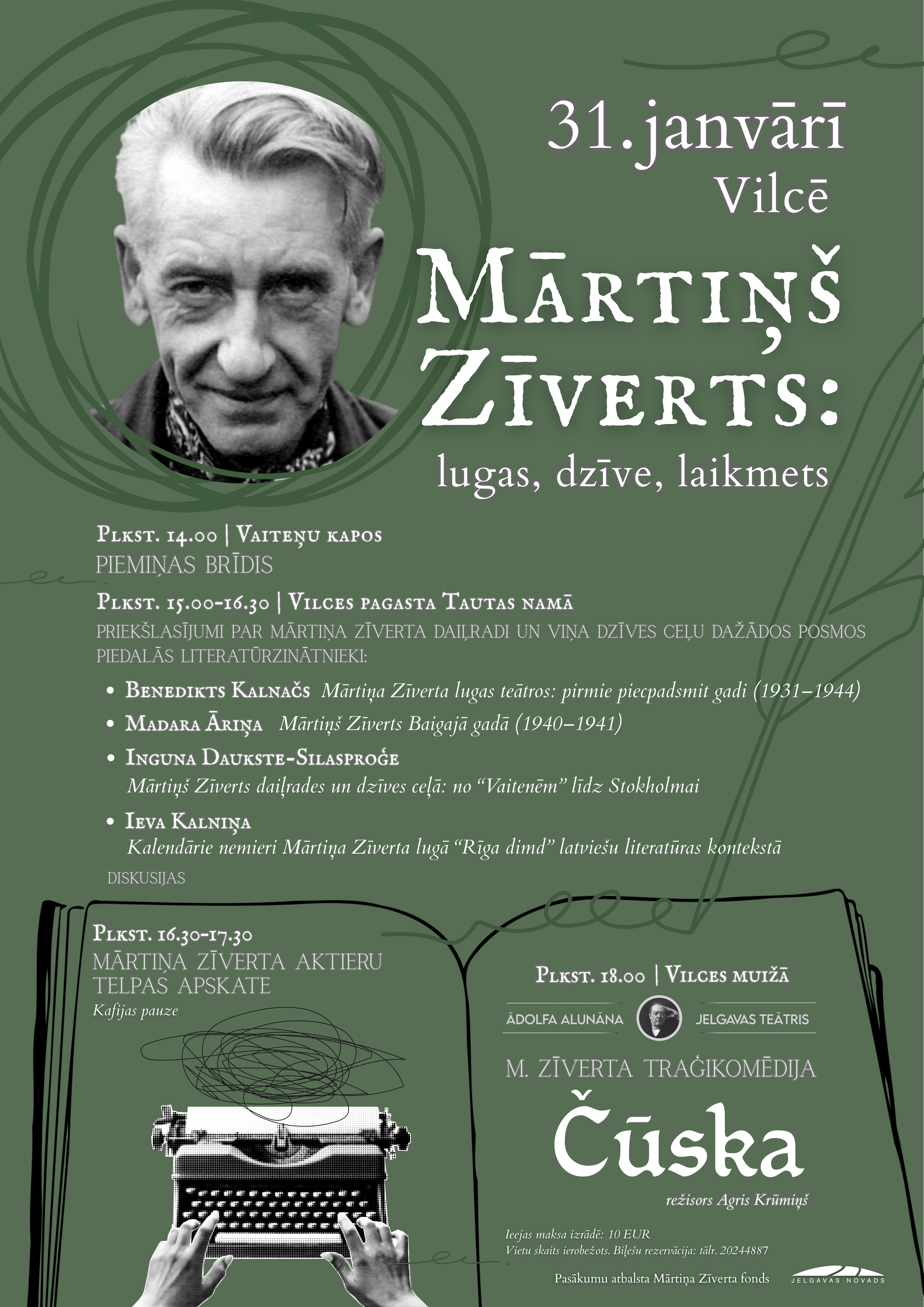 Sestdien, 31. janvārī, Mārtiņa Zīverta jubilejas mēneša izskaņā viņa dzimtajā vietā Vilcē notiks dramaturga daiļrades izpētei un popularizēšanai veltīti pasākumi. Tajos piedalīsies arī LU Literatūras, folkloras un mākslas institūta vadošā pētniece Inguna Daukste-Silasproģe un vadošais pētnieks Benedikts Kalnačs.