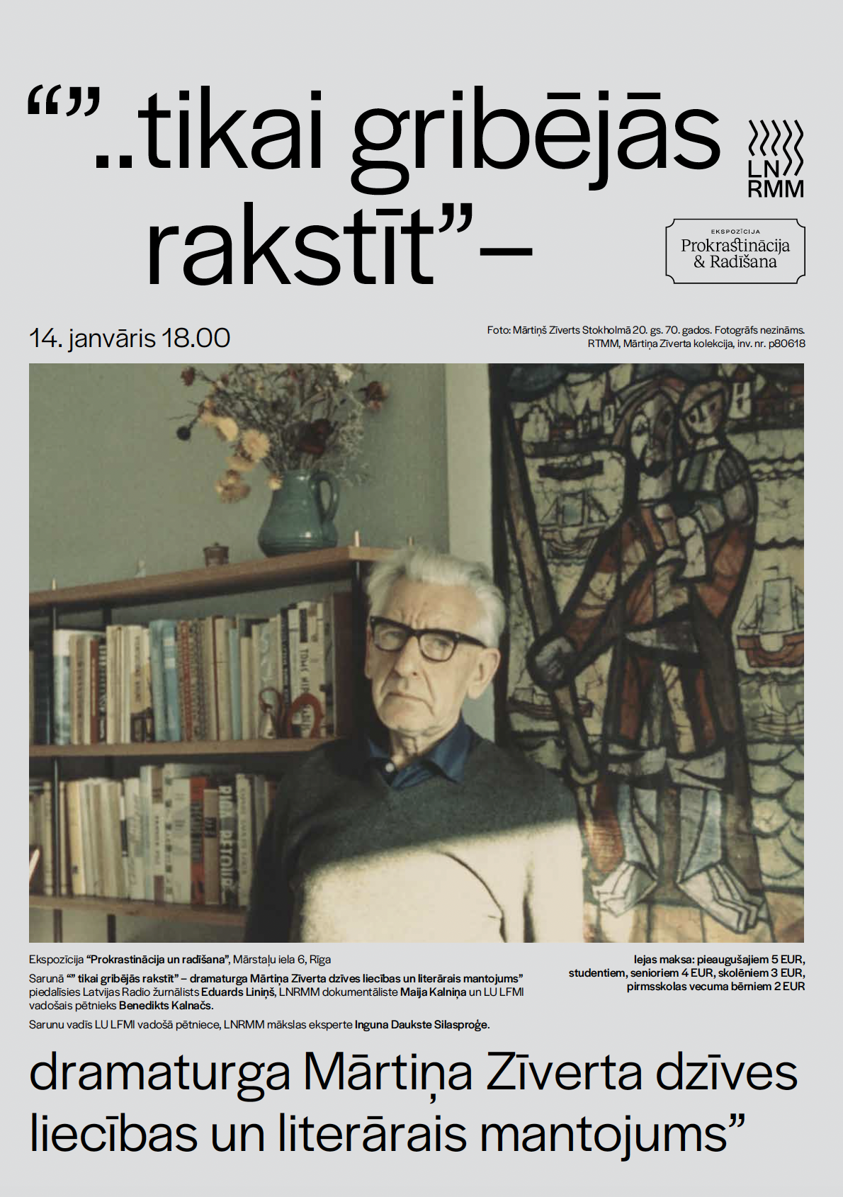 Sarunas centrā būs Mārtiņa Zīverta personība un literārā mantojuma stāsti – no kolekcijas izveides pirmsākumiem, materiālu papildināšanas dažādos laikos līdz epizodei LNRMM ekspozīcijā “Prokrastinācija&radīšana”, personību kolekciju nozīme atmiņu institūcijās, kā arī Mārtiņa Zīverta nozīme un devums latviešu dramaturģijā un teātrī. Viņš pieredzēja pirmo padomju gadu, vācu okupācijas laiku un ilgus trimdas gadus. Vai un kādu ietekmi tas atstāja uz viņa literārā mantojuma saglabāšanu un ko iespējams atrast viņa kolekcijā? – būs tikai daži no jautājumiem. Sarunu vadīs Inguna Daukste-Silasproģe.