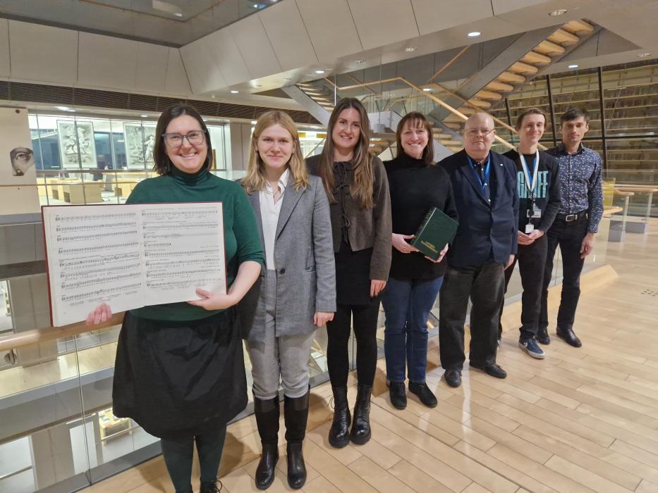 Attēlā projekta darba grupa (no kreisās): projekta vadītāja, muzikoloģe Ieva Vīvere, datorzinātņu doktorante Linda Barbare, folkloristikas doktorante Arta Krūze, folkloriste Ginta Pērle-Sīle, muzikologs Mārtiņš Boiko, doktora grāda pretendents muzikoloģijā Dāvis Eņģelis un datorzinātnieks Kārlis Freivalds.